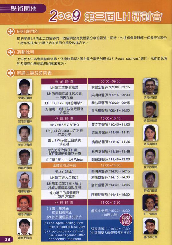 提供學過LH矯正法的醫師們一個繼續教育及經驗分享的管道,同時,也提供醫師們一個發表的舞台,持平的提出LH矯正法的使用心得及改進方法。 LH 研 討 會 於 2009 年 4 月 26 日 舉 辦 演講主題:LH in ClassⅢ真的可以?! 講 師:黎 浩 斌 醫師